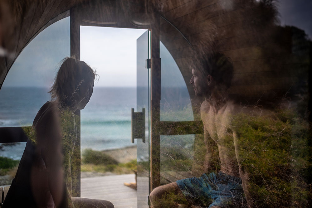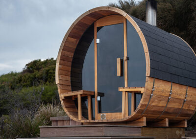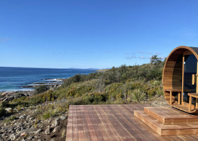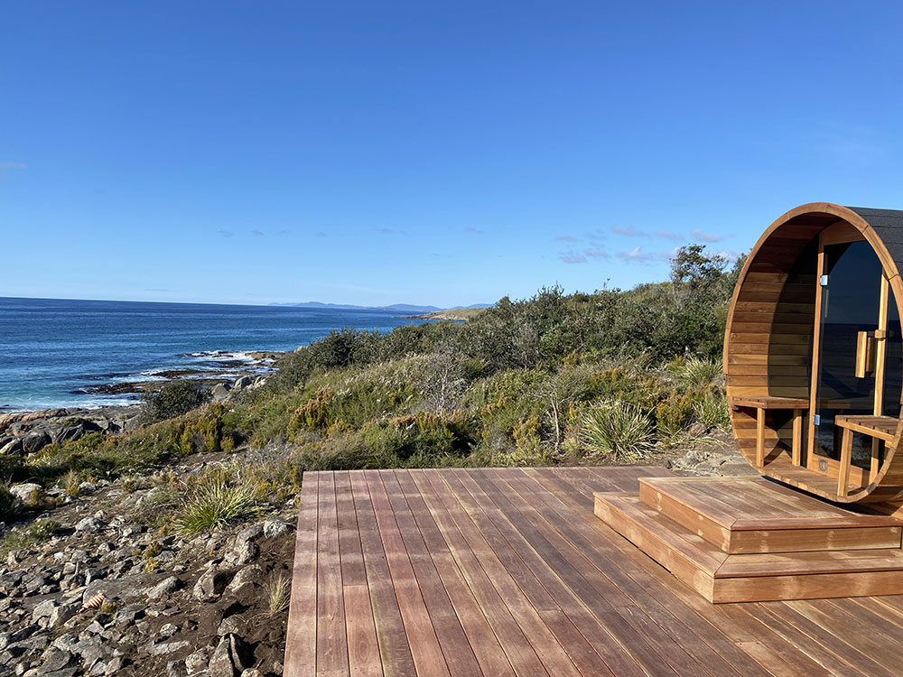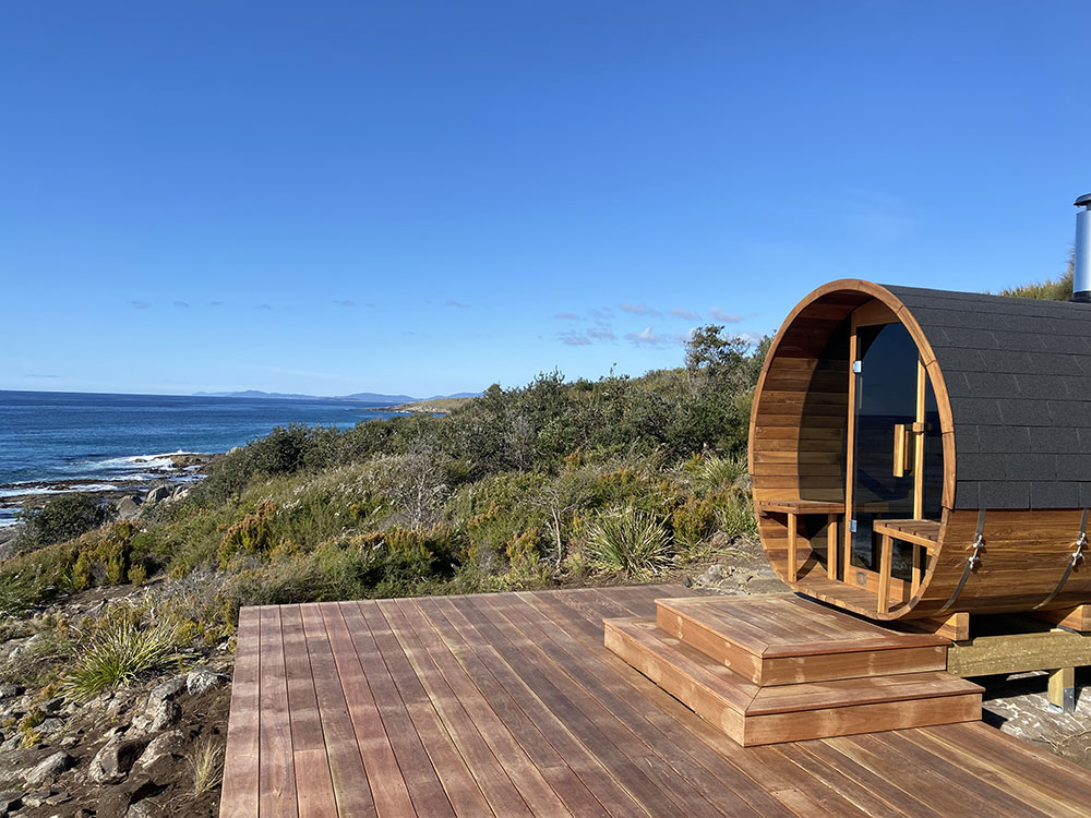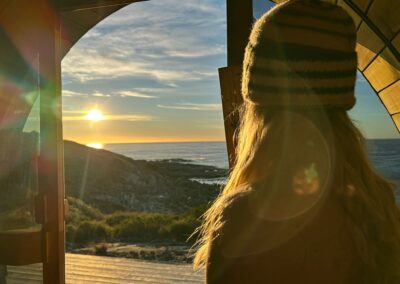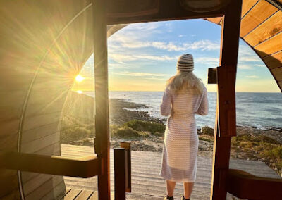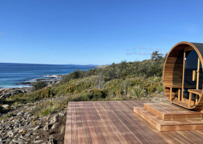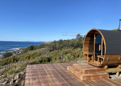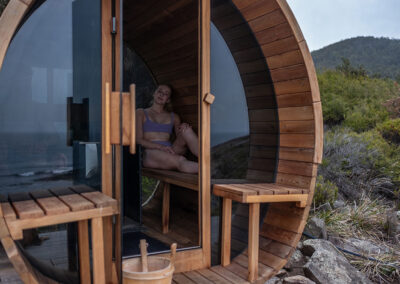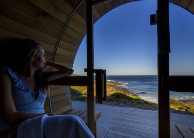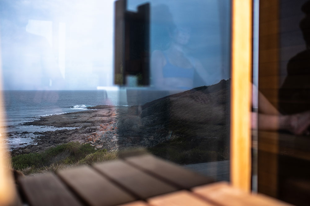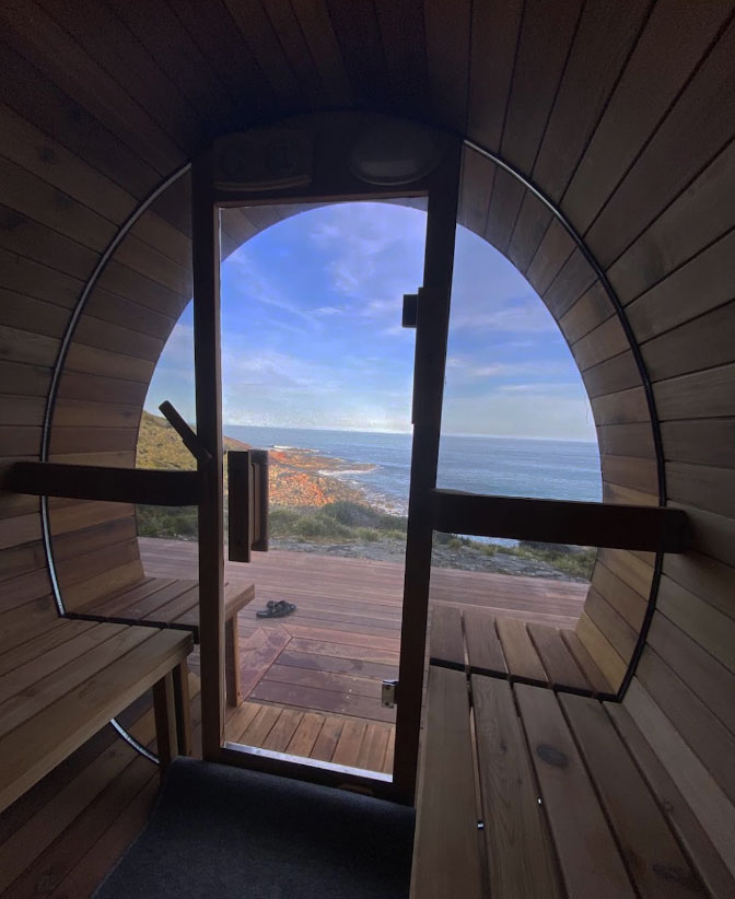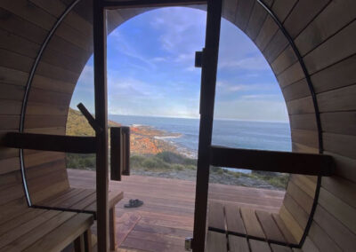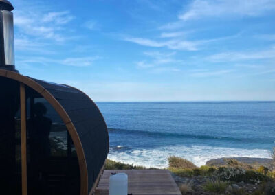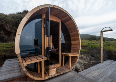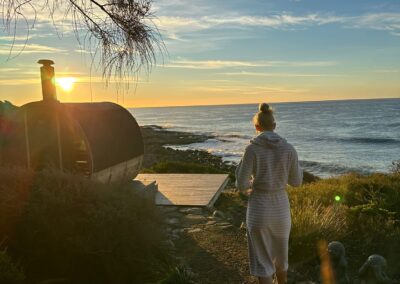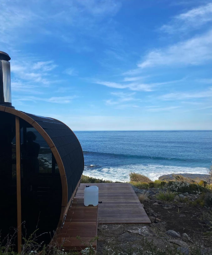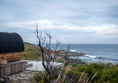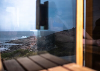 This is a traditional, wood-fired sauna where you light your own fire. There is nothing quite like the glow and warmth of real flames, the gentle crackle of timber, and the view of the ocean and rocky shoreline below as you unwind.