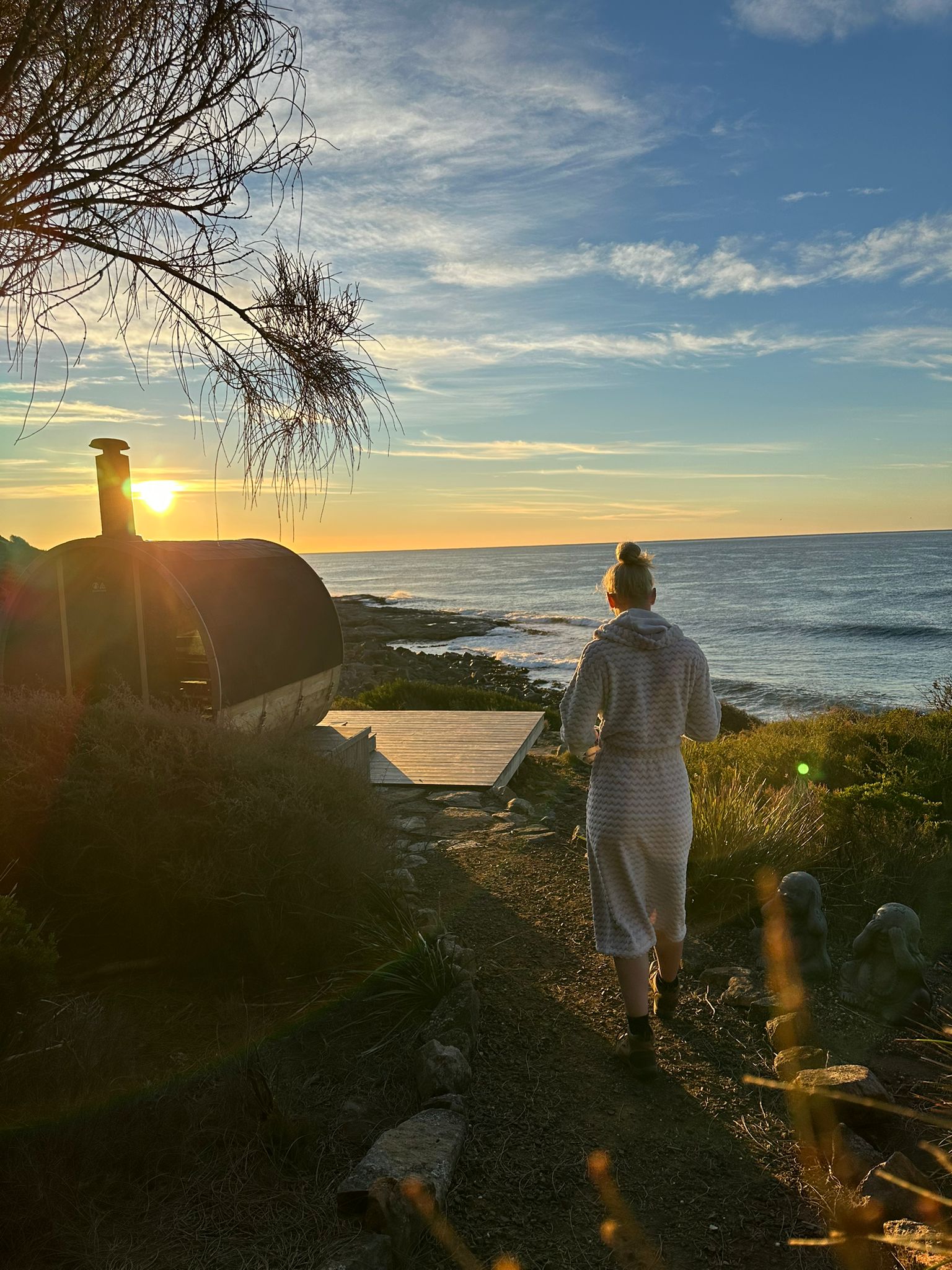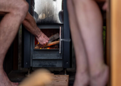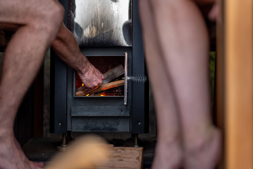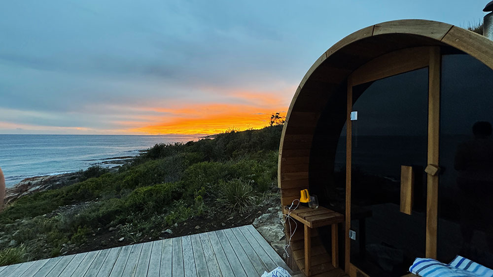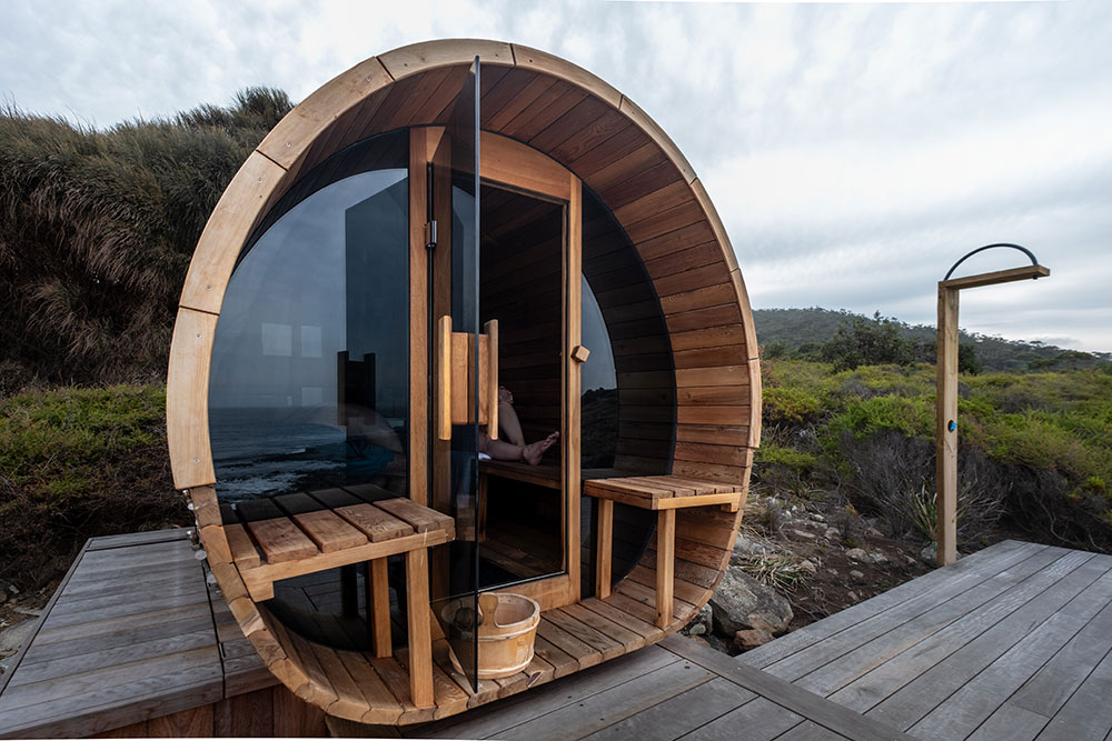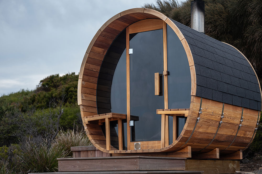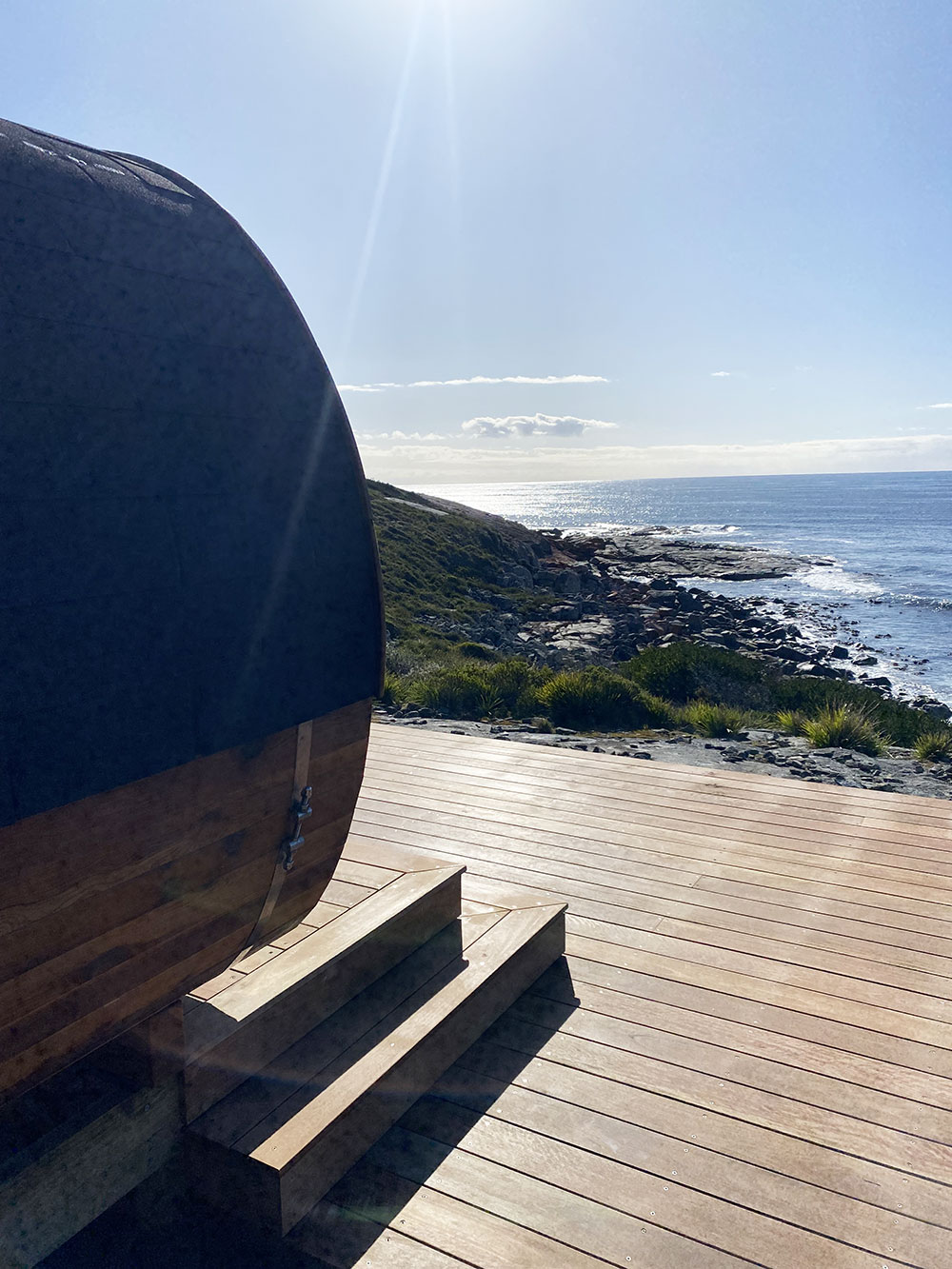 This is a traditional, wood-fired sauna where you light your own fire. There is nothing quite like the glow and warmth of real flames, the gentle crackle of timber, and the view of the ocean and rocky shoreline below as you unwind.